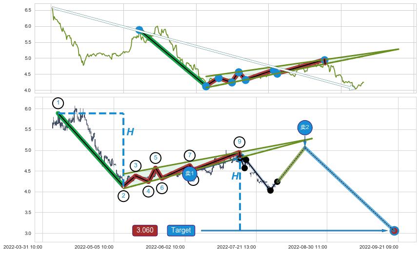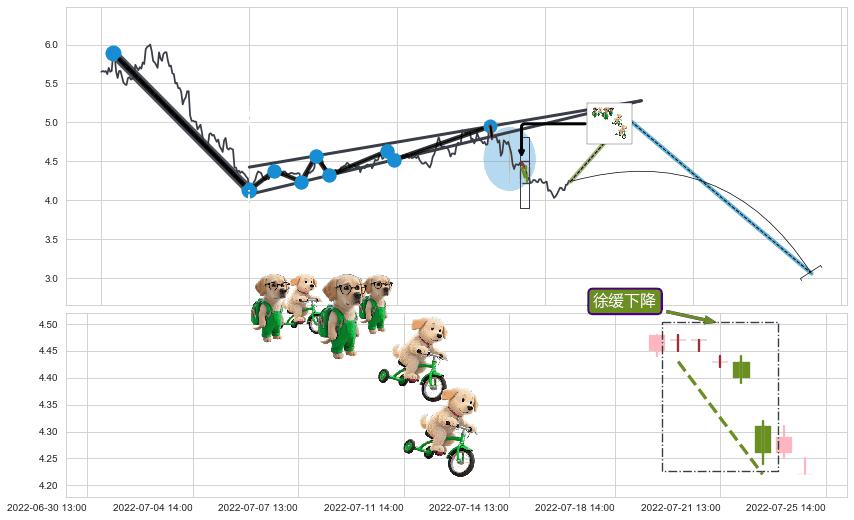 从2022-05-23 09:00至2022-06-14 11:00,共包含78个小时,阶段股价下跌-3.11%,阶段股价变动位移路程比: 1 : 15