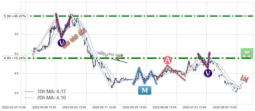 ♘ 阻力价格位4.89,可信任强度89.55%,距离最后交易2022-08-12 14:00形成的收盘价格4.24相差 +15.24%