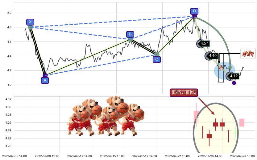 ➢ 收盘价(07-12:13: 4.77 )→回踩→第一根k线低点(07-08:14: 4.74 )