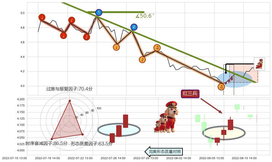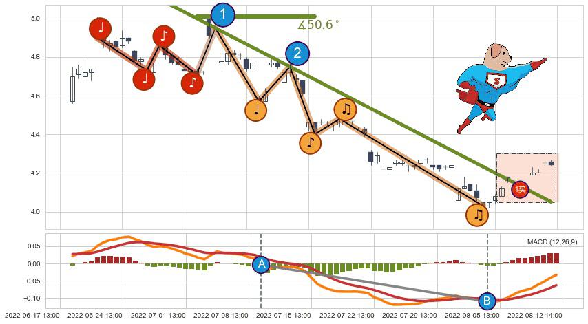 ⚔️ 2022-06-22 13:00-2022-08-11 14:00下跌趋势存在反转上涨[机会],其原下跌趋势的阻力位(4.05)已被突破[强支撑信号],原下跌趋势角度: 50.6˚