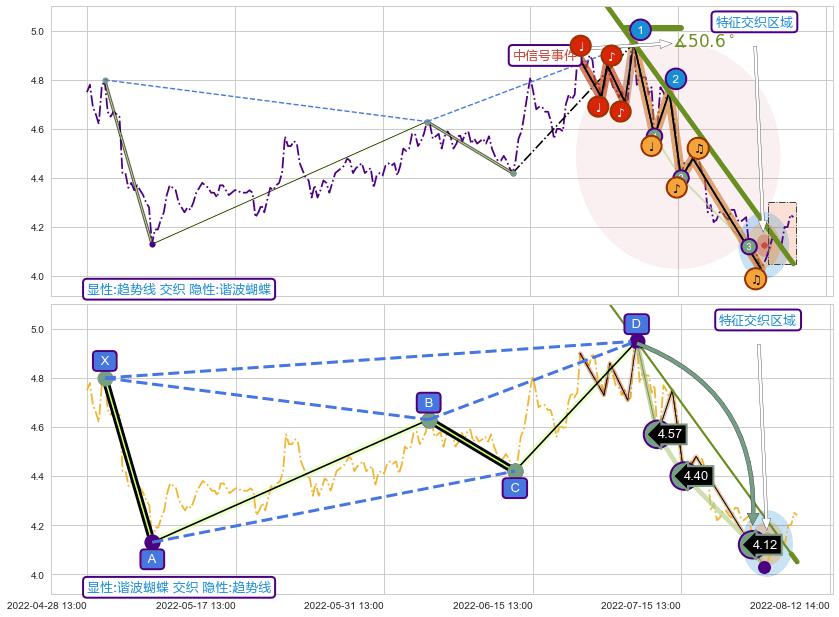 从2022-06-22 13:00至2022-08-11 14:00,共包含72个小时,阶段股价下跌-14.76%,阶段股价变动位移路程比: 1 : 4,下跌趋势角度: 50.6,2022-07-11 13:00向↘︎形成缺口,跳空下跌-4.19%˚
