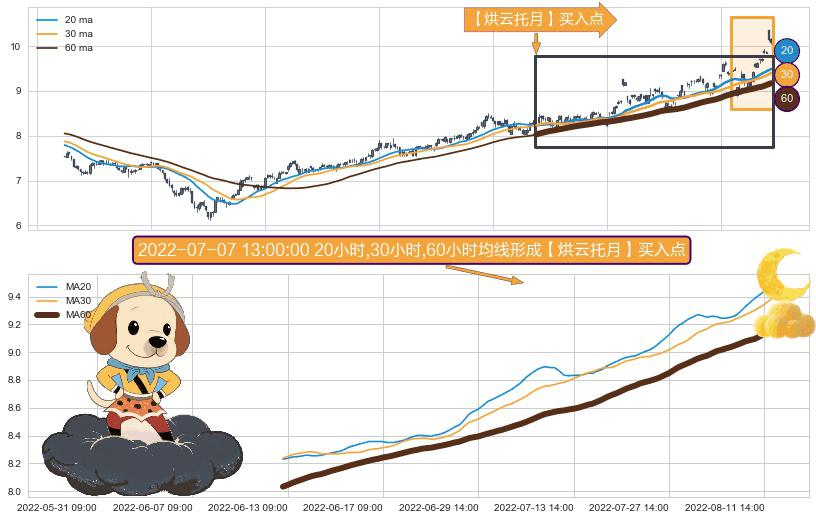 形态多维评估: ⚀ 2022-06-10 14:00:00小时-2022-08-12 14:00:00小时显现 20小时-30小时-60小时均线 【烘云托月】买入点 看多信号,后市看涨,买入