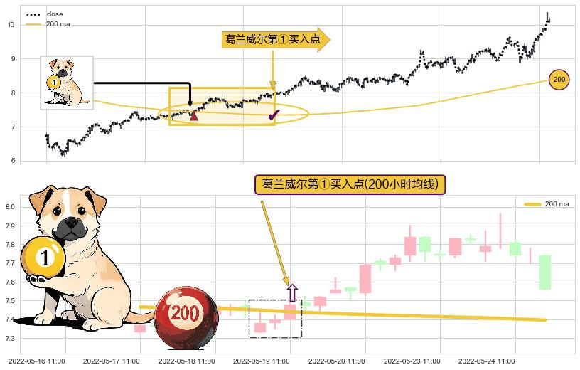 形态多维评估: ⚀ 2022-05-19 11:00:00-小时显现 葛兰威尔均线 200小时均线 第买①入点 走势反转见底信号,后市看涨,买进信号