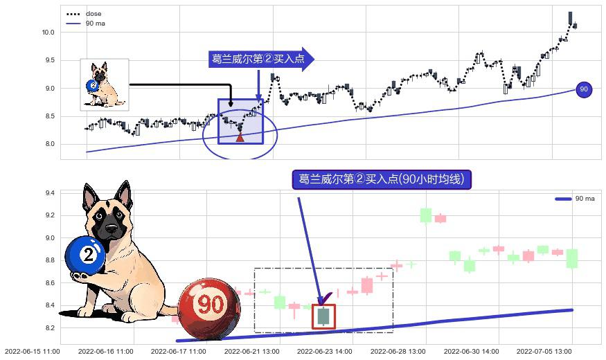 形态多维评估: ⚀ 2022-06-22 14:00:00-小时显现 葛兰威尔均线 90小时均线 第②买入点 上升趋势的中继信号,后市看涨,买进信号