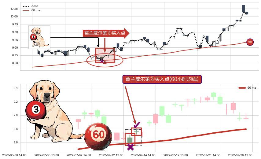形态多维评估: ⚀ 2022-07-13 13:00:00-小时显现 葛兰威尔均线 60小时均线 第③买入点 上升趋势的中继信号,后市看涨,买进信号