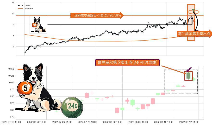 形态多维评估: ⚀ 2022-08-12 13:00:00-小时显现 葛兰威尔均线 240小时均线 第⑤卖出点 上升趋势均值回复的短线回落信号,后市看跌,卖出信号
