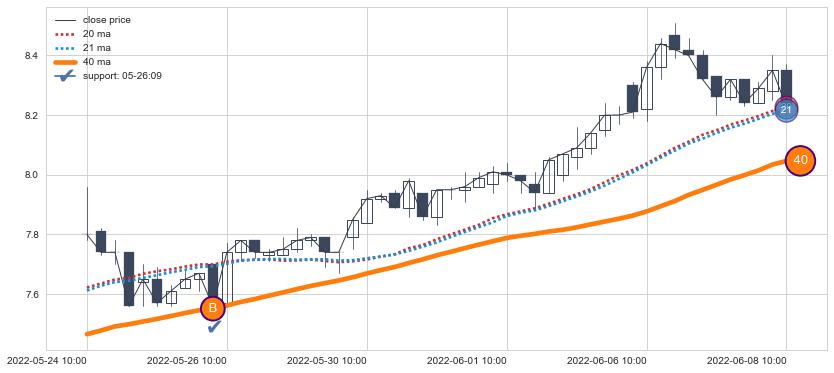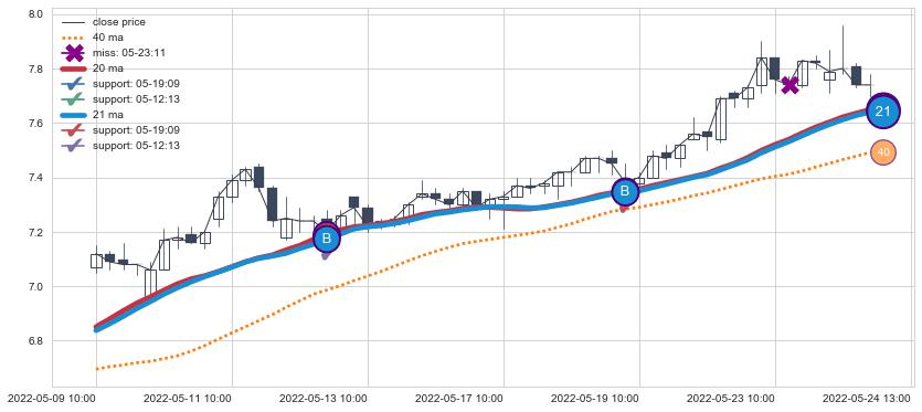 上涨趋势05-09 10:00-05-24 13:00,均线20, 21确认关键支撑2处