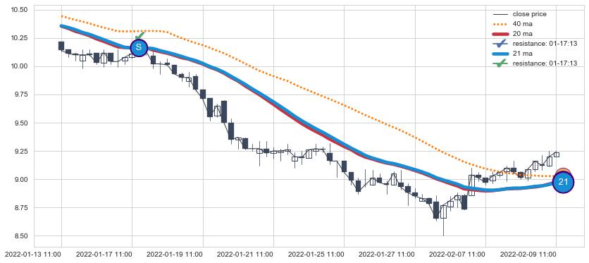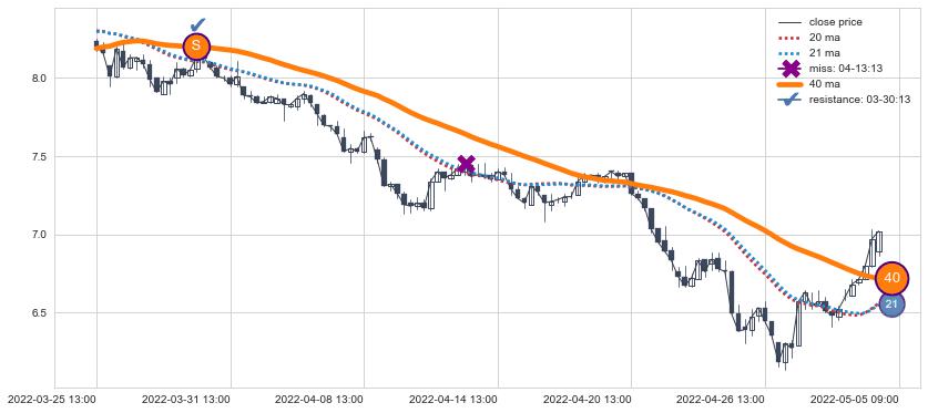 下跌趋势03-25 13:00-05-05 09:00,均线40确认关键阻力1处