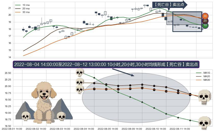 ⚀ 2022-08-05 13:00:00-小时至2022-08-12 13:00:00-小时显现 10小时-20小时-30小时均线 【死亡谷】卖出点 看空信号,后市看跌,卖出