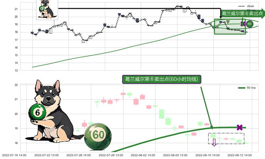 ⚀ 2022-08-10 13:00:00-小时显现 葛兰威尔均线 60小时均线 第⑥卖出点 走势反转见顶信号,后市看跌,卖出信号