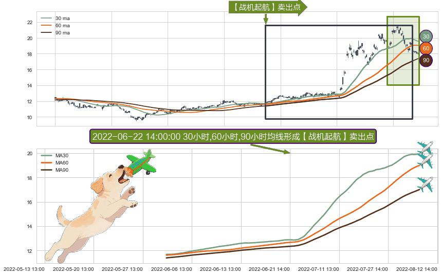 ⚀ 2022-06-01 09:00:00小时-2022-08-09 14:00:00小时显现 30小时-60小时-90小时均线 【战机起航】卖出点 看空信号,后市看跌,卖出