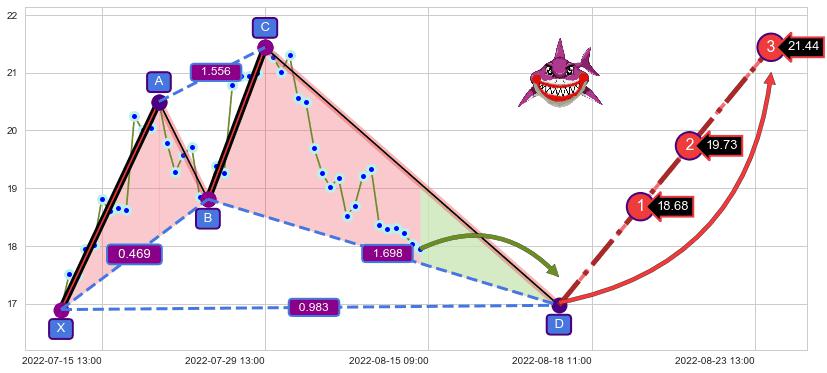 ➢ 接近预测D点位置, 随时警戒看涨【鲨鱼】形态反转启动