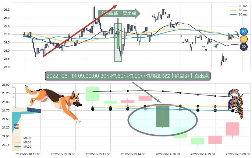 ⚀ 2022-06-14 09:00:00小时显现 30小时-60小时-90小时均线 【绝命跳】卖出点 看空信号,后市看跌,卖出
