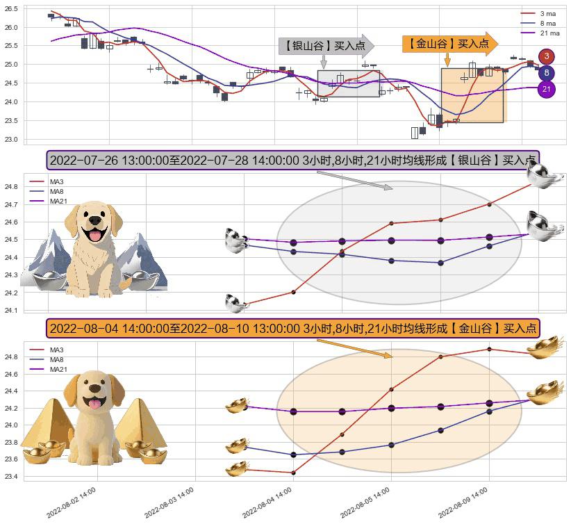 ⚃ 2022-08-05 13:00:00-小时至2022-08-10 13:00:00-小时显现 3小时-8小时-21小时均线 【金山谷】买入点 其再次确认了买入信号,可靠性更强,买入