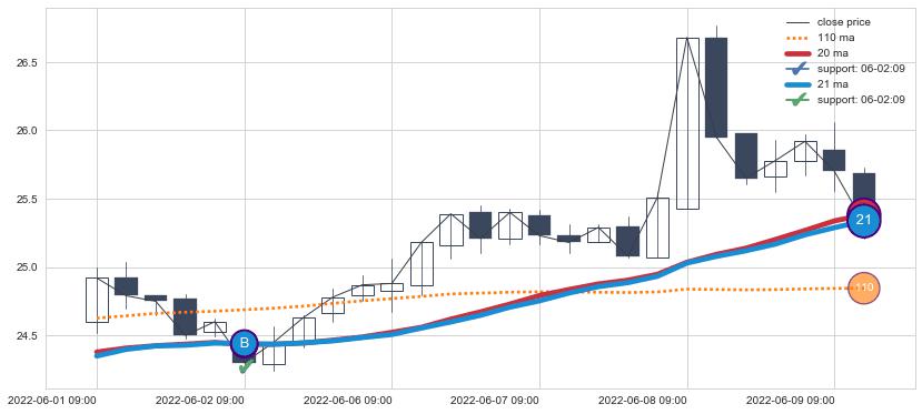 ⚀ 中期均线MA8上穿长期均线MA21形成的交叉是标准 黄金交叉