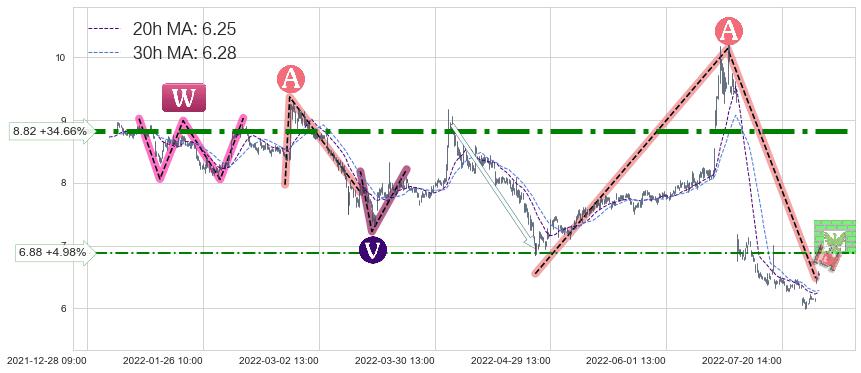 ♘ 阻力价格位6.88,可信任强度42.36%,距离最后交易2022-08-12 14:00形成的收盘价格6.55相差 +4.98%