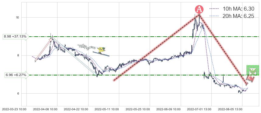 ♘ 阻力价格位8.98,可信任强度52.23%,距离最后交易2022-08-12 14:00形成的收盘价格6.55相差 +37.13%