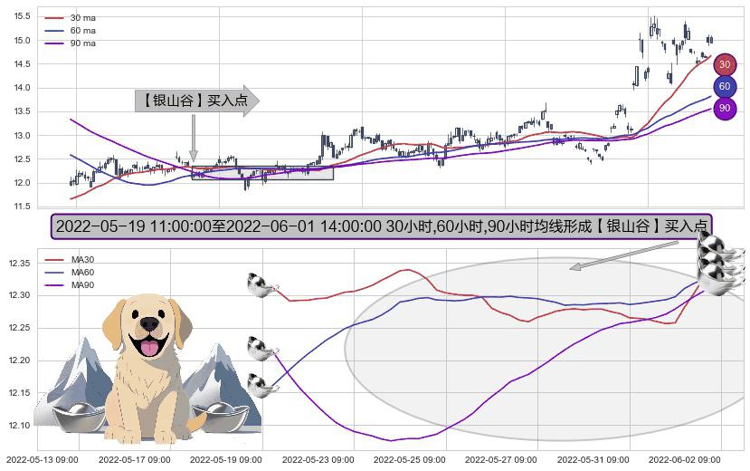 ⚀ 2022-05-19 13:00:00-小时至2022-06-01 14:00:00-小时显现 30小时-60小时-90小时均线 【银山谷】买入点 看多信号,后市看涨,买入