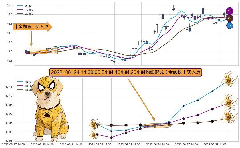 ⚀ 2022-06-24 14:00:00小时显现 5小时-10小时-20小时均线 【金蜘蛛】买入点 看多信号,后市看涨,买入