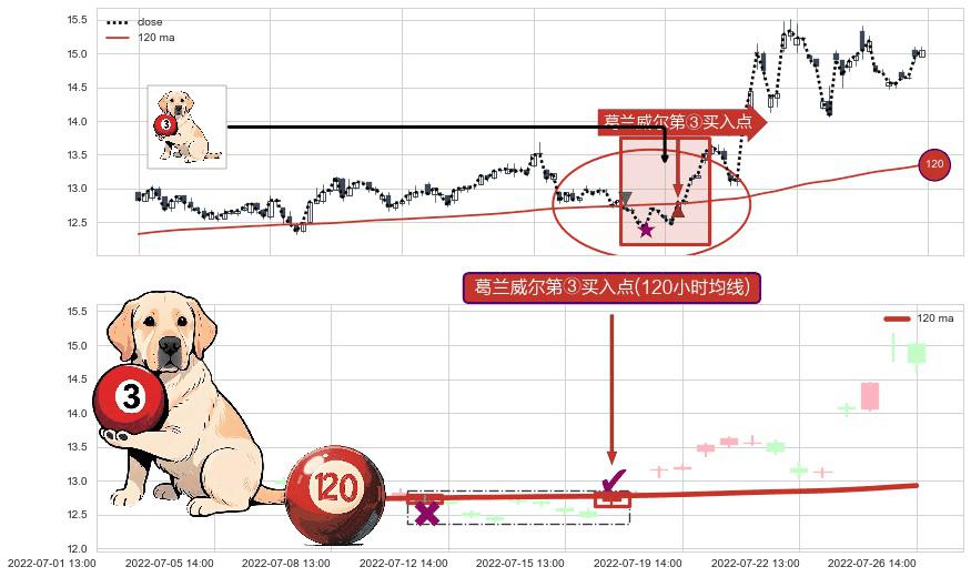 ⚀ 2022-07-18 13:00:00-小时显现 葛兰威尔均线 120小时均线 第③买入点 上升趋势的中继信号,后市看涨,买进信号