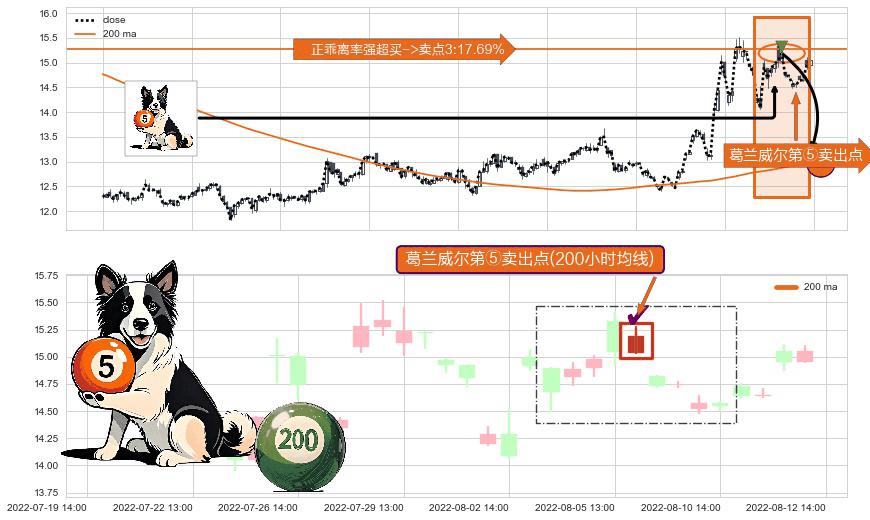 ⚀ 2022-08-05 14:00:00-小时显现 葛兰威尔均线 200小时均线 第⑤卖出点 上升趋势均值回复的短线回落信号,后市看跌,卖出信号