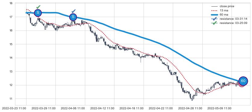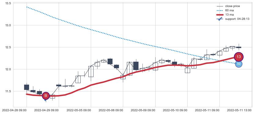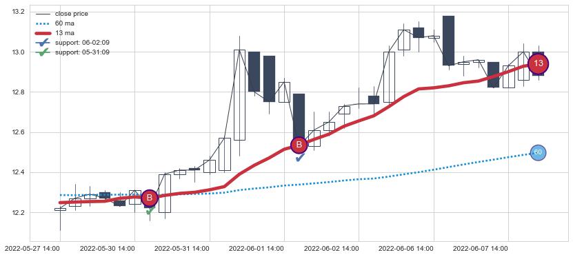 ⚂ 2022-07-12 13:00:00-小时均线向下破位,2022-07-18 13:00:00-小时重新上穿突破均线,均线支撑再次生效