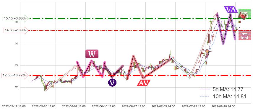 ♘ 阻力价格位15.15,可信任强度79.34%,距离最后交易2022-08-12 14:00形成的收盘价格15.05相差 +0.63%