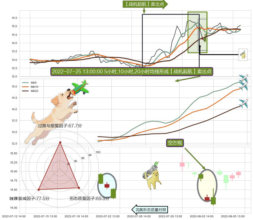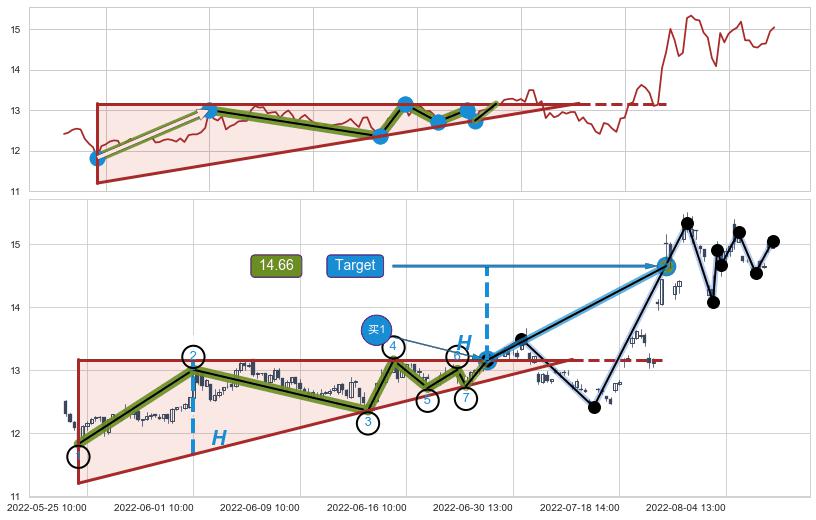 从2022-07-13 14:00至2022-07-28 14:00,共包含23个小时,阶段股价上涨21.85%,阶段股价变动位移路程比: 1 : 1.9,2022-07-25 13:00向⇪形成缺口,跳空上涨+6.92%