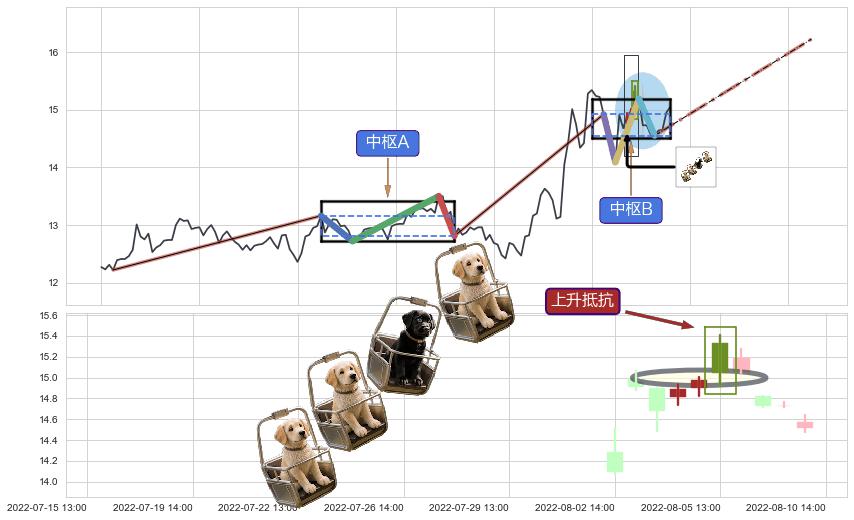 ➢ 【中枢B】:08-01:13-08-10:14,中枢由4笔构成,共14交易小时, ZG=14.92, ZD=14.55