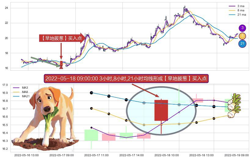 ⚀ 2022-05-18 09:00:00小时显现 3小时-8小时-21小时均线 【旱地拔葱】买入点 看多信号,后市看涨,买入