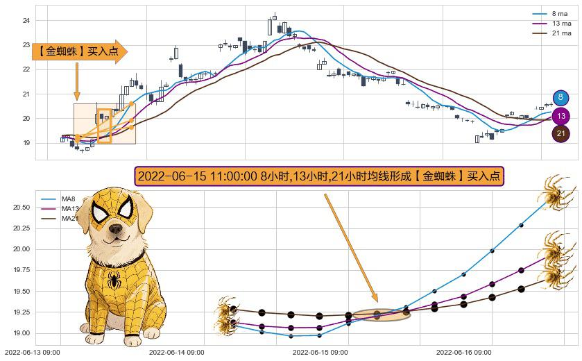 ⚀ 2022-06-15 11:00:00小时显现 8小时-13小时-21小时均线 【金蜘蛛】买入点 看多信号,后市看涨,买入