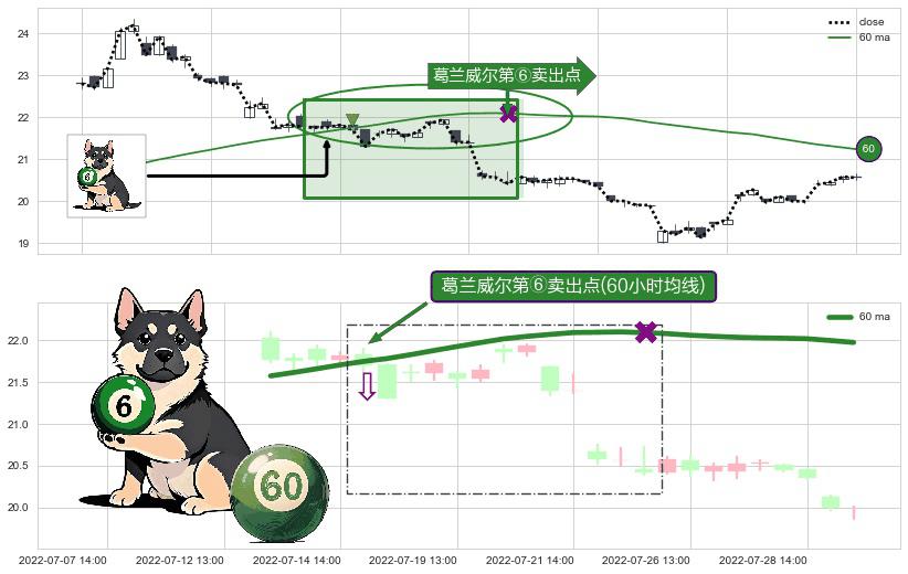 ⚀ 2022-07-15 13:00:00-小时显现 葛兰威尔均线 60小时均线 第⑥卖出点 走势反转见顶信号,后市看跌,卖出信号