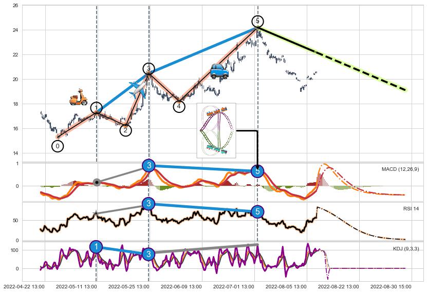 ➢ 1,3,5驱动浪MACD, RSI, KDJ走势都出现【常规背离】反转信号增强