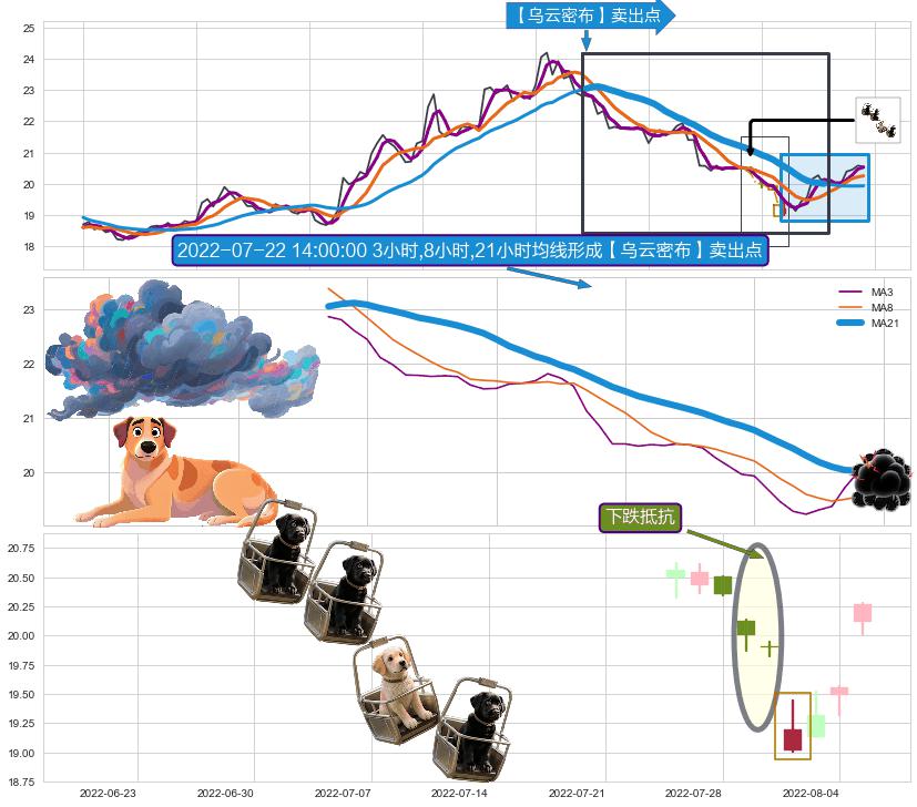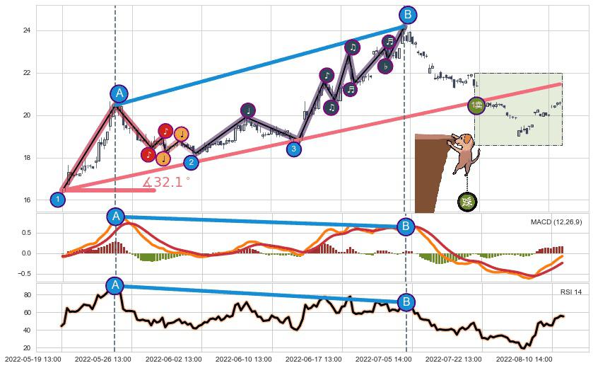 从2022-07-04 14:00至2022-08-03 14:00,共包含45个小时,阶段股价下跌-23.06%,阶段股价变动位移路程比: 1 : 1.8