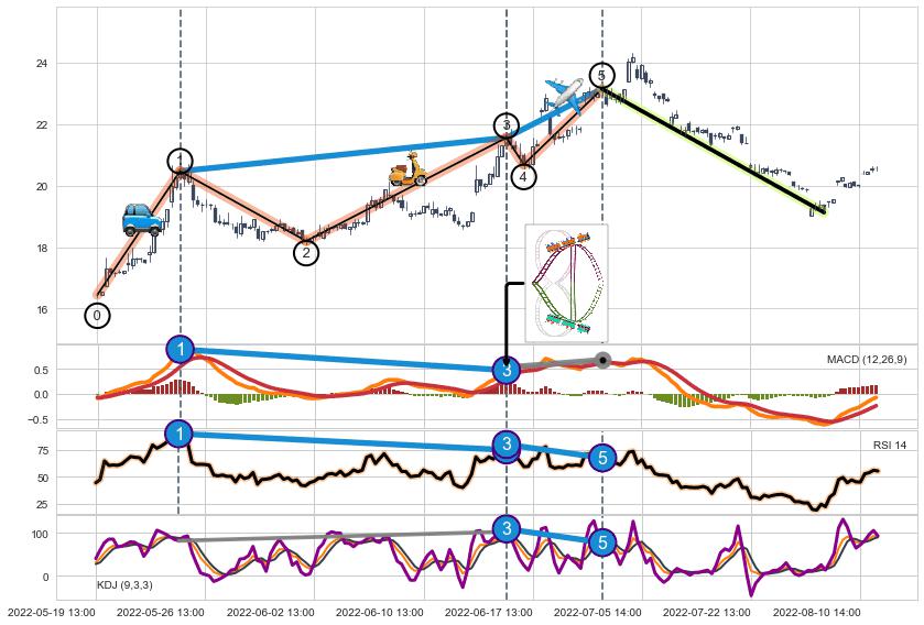 ➣ 1,3,5驱动浪MACD, RSI, KDJ走势都出现【常规背离】反转信号增强