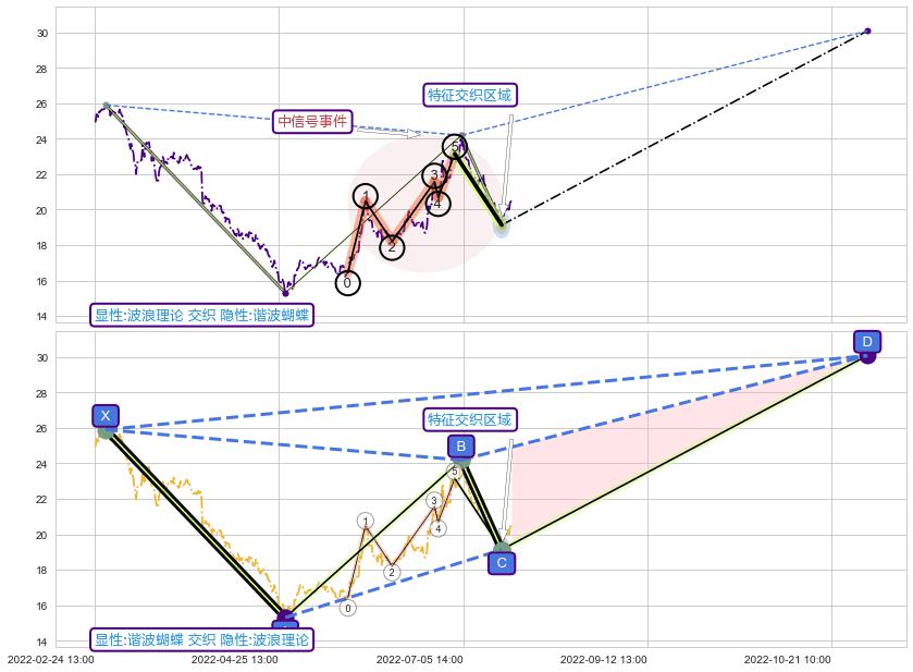 从2022-05-19 13:00至2022-06-14 11:00,共包含85个小时,阶段股价上涨13.56%,阶段股价变动位移路程比: 1 : 5