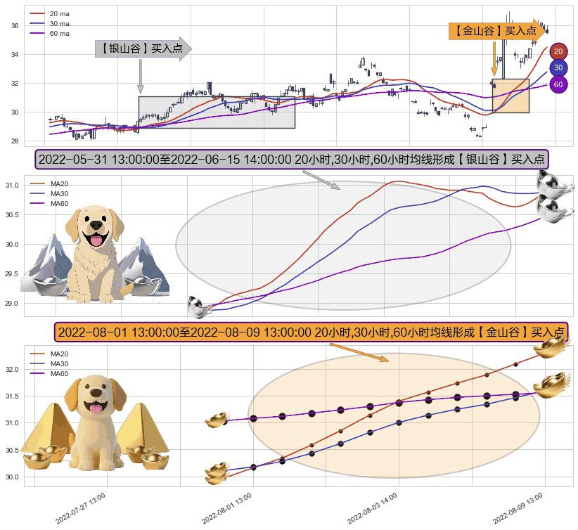 ⚀ 2022-08-01 14:00:00-小时至2022-08-09 13:00:00-小时显现 20小时-30小时-60小时均线 【金山谷】买入点 其再次确认了买入信号,可靠性更强,买入