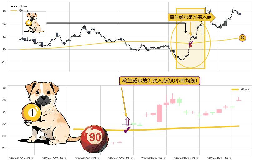 ⚀ 2022-07-28 13:00:00-小时显现 葛兰威尔均线 90小时均线 第买①入点 走势反转见底信号,后市看涨,买进信号