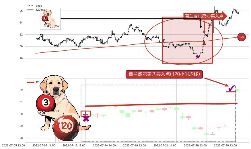 ⚀ 2022-07-28 13:00:00-小时显现 葛兰威尔均线 120小时均线 第③买入点 上升趋势的中继信号,后市看涨,买进信号