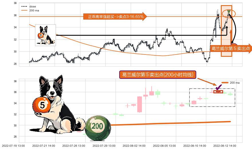 ⚀ 2022-08-11 14:00:00-小时显现 葛兰威尔均线 200小时均线 第⑤卖出点 上升趋势均值回复的短线回落信号,后市看跌,卖出信号