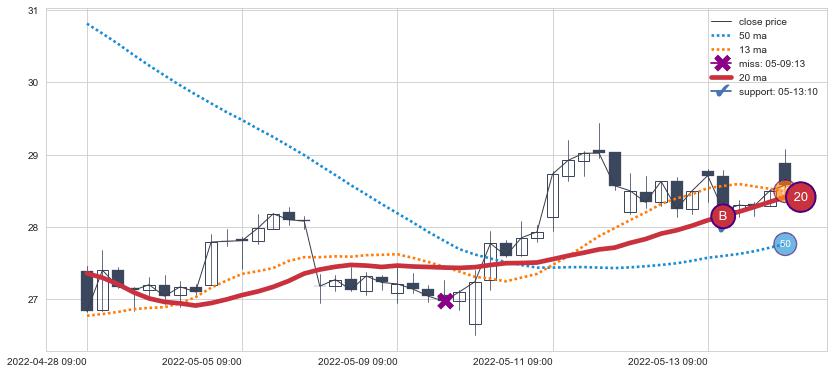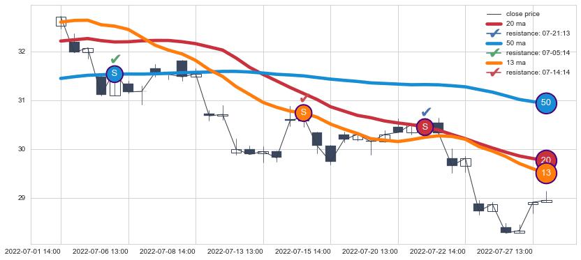 ⚂ 2022-07-12 13:00:00-小时均线向下破位,2022-07-28 13:00:00-小时重新上穿突破均线,均线支撑再次生效