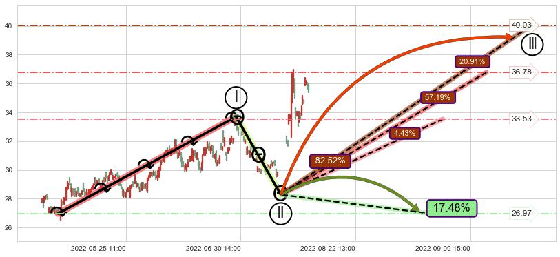 从2022-03-23 11:00至2022-05-11 10:00,共包含150个小时,阶段股价下跌-34.05%,阶段股价变动位移路程比: 1 : 3,下跌趋势角度: 64.2