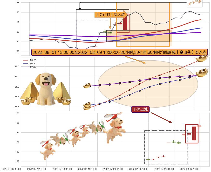 | 6 🅚:下探上涨 ➕ 🎢:【金蜘蛛】买入点均线组合买入点信号形成后,猜想三条均线周期内的交易者都看好后市,持续上涨 ☞ 看多信号 ⇥ 【均线】交织【🅚线】⇥ 综合量化分数: 65 | > |