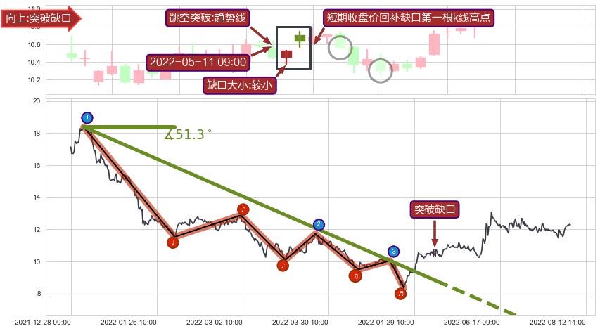 ➣ 2021-12-31 09:00-2022-05-11 10:00下跌趋势存在反转上涨[机会],其原下跌趋势的阻力位(5.15)已被突破[强支撑信号],原下跌趋势角度: 51.3˚