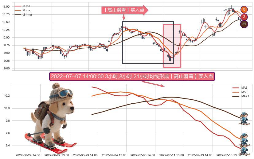 ⚀ 2022-06-29 13:00:00小时-2022-07-18 13:00:00小时显现 3小时-8小时-21小时均线 【高山滑雪】买入点 看多信号,后市看涨,买入