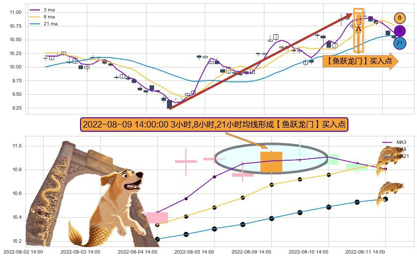 ⚀ 2022-08-09 14:00:00小时显现 3小时-8小时-21小时均线 【鱼跃龙门】买入点 看多信号,后市看涨,买入
