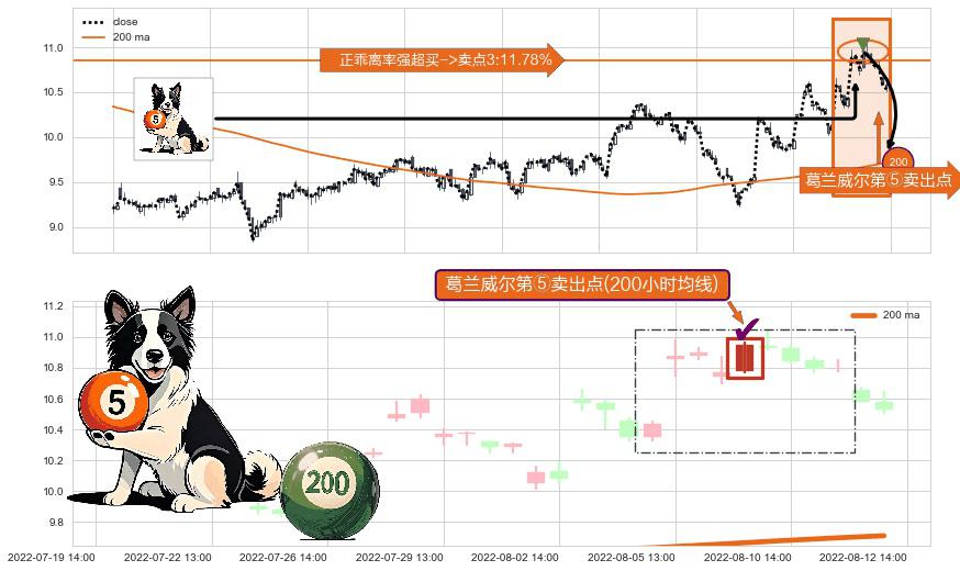 ⚀ 2022-08-09 14:00:00-小时显现 葛兰威尔均线 200小时均线 第⑤卖出点 上升趋势均值回复的短线回落信号,后市看跌,卖出信号