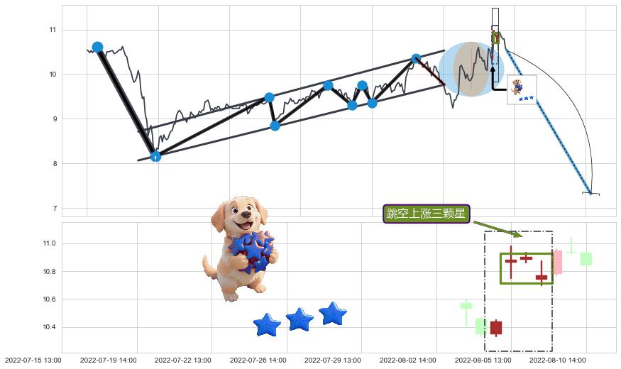 ➢ 高点影线(07-14:13: 9.66 )→回踩→第二根k线高点(07-13:13: 9.65 )