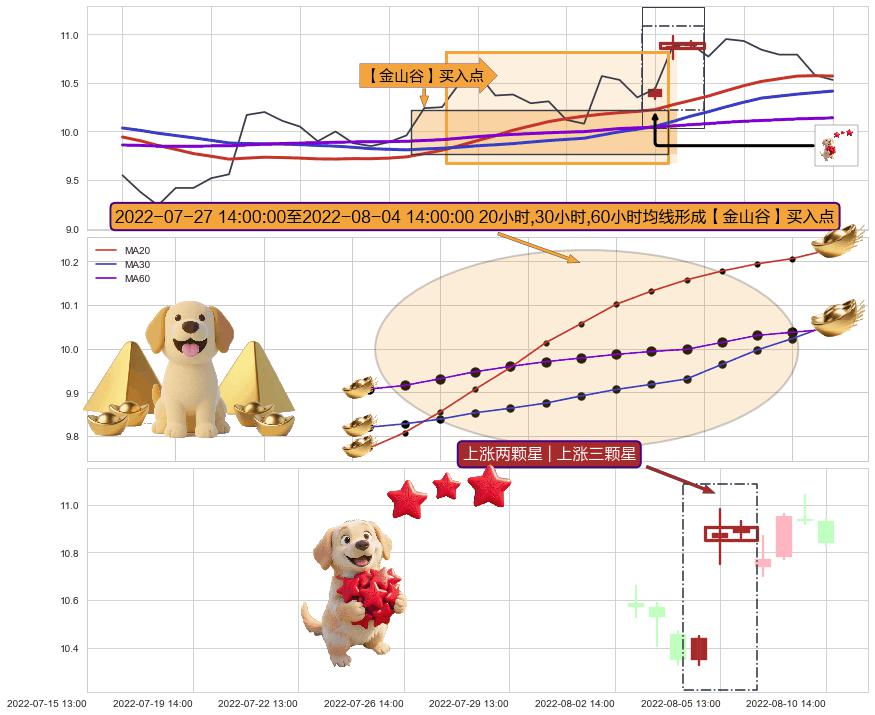 | 4 🅚:下探上涨 ➕ 🎢:【金银山谷】买入点均线组合买入点信号形成后,猜想后续突破上升,沿着向上的尖头三角上涨 ☞ 看多信号 ⇥ 【均线】交织【🅚线】⇥ 综合量化分数: 61 | > |