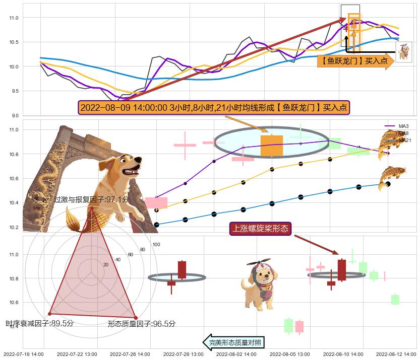 从2022-07-15 14:00至2022-08-12 13:00,共包含38个小时,阶段股价上涨14.18%,阶段股价变动位移路程比: 1 : 3,上涨趋势角度: 36.3,2022-07-20 13:00向⇪形成缺口,跳空上涨+6.38%